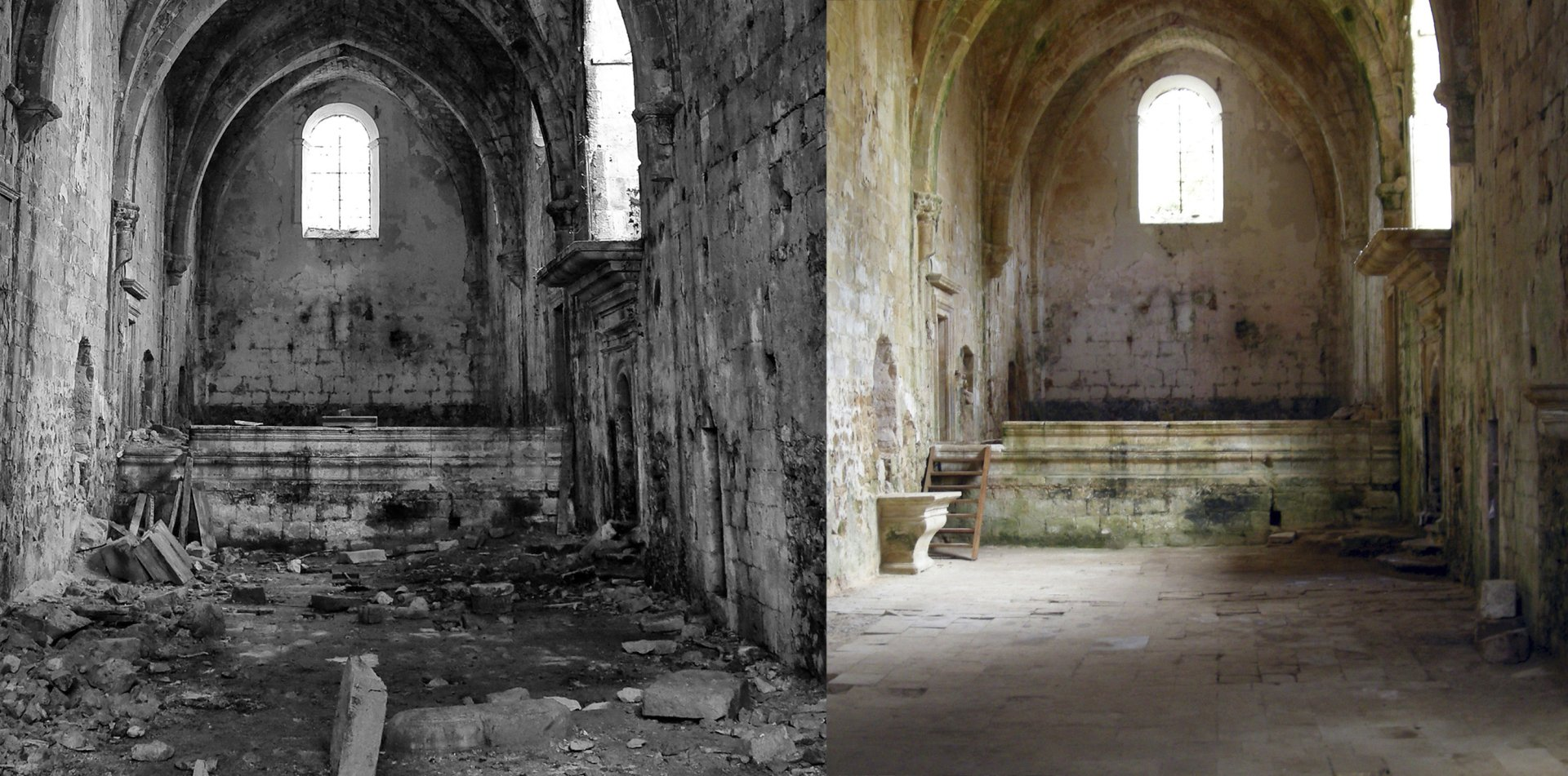 Durante esta semana recuperamos el interior de la iglesia. Para ello, retiramos escombros, recolocamos las piedras del suelo, rellenamos con grijo las tumbas profanadas, colocamos de nuevo las piedras de los altares, acondicionamos la cripta y las escaleras de caracol que suben al campanario, levantamos parte del muro del cementerio que estaba derruido y parte del muro exterior que rodea el monasterio, desbrozamos y acondicionamos los exteriores de la iglesia..
