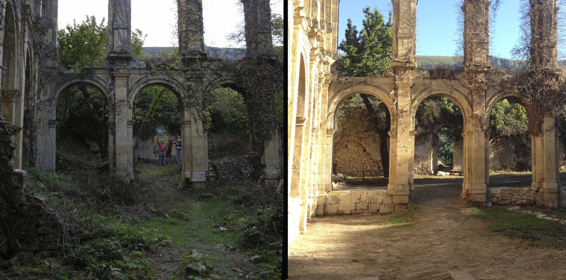 Quitamos los escombros de la panda de la Cilla, que se encontraba casi totalmente derruida y limpiamos los escombros del suelo de la panda sur del claustro, es decir de la panda del Refectorio,; recuperamos el camino al patio de la hospedería, volvimos a desbrozar los huertos, arreglar las calles del monasterio, etc.