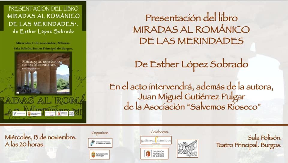 El miércoles, 11 de noviembre, a las 20h, en la sala Polisón del Teatro Principal de Burgos, tendrá lugar la presentación de este libro, “Miradas al románico de Las Merindades”, y el próximo día 30, a las 18:30h en la Casa de Cultura de Villarcayo. No os perdáis esta estupenda ocasión para charlar con la autora sobre las mejores obras de arte medieval de las Merindades.