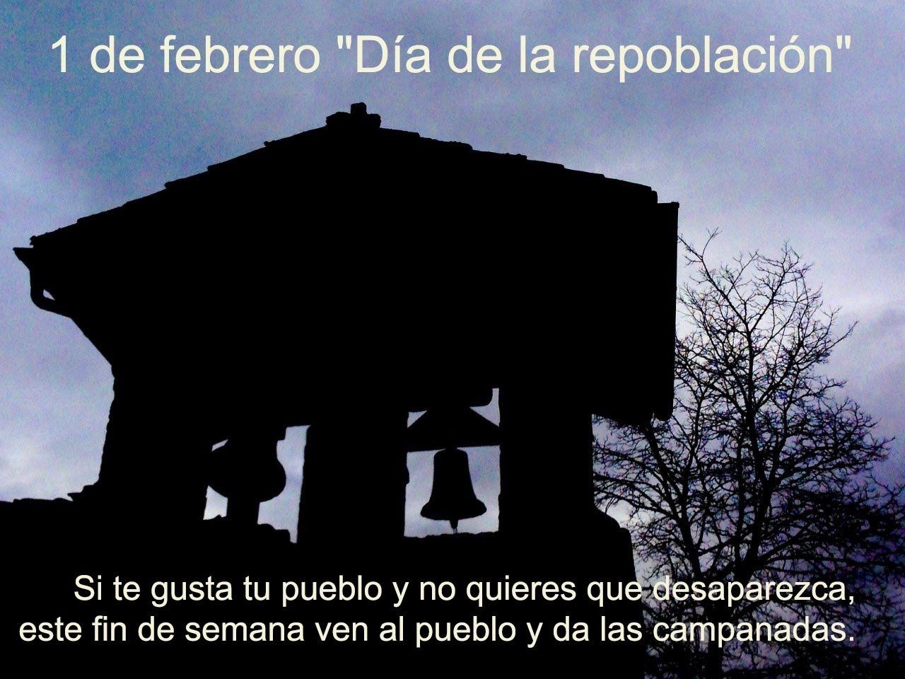 La Asociación "El Priorato de San Miguel", de Pedroso, Burgos, nos hace un llamamiento para celebrar el 1 de febrero como el "Día de la repoblación" y nos pide que en todos los pueblos hagamos sonar nuestras campanas ese día, a la 1h de la tarde. El objetivo de este movimiento social es hacer una llamada de atención hacia esa España vaciada que esta extinguiéndose y a la que tenemos que apoyar porque la estamos perdiendo. Por ello, para que todos tomemos conciencia del problema, ese día, durante cinco minutos, en muchas iglesias se tocaran las campanas. En el Valle de Manzanedo, que sufrimos el problema de la despoblación en primera persona, también nos uniremos a esta iniciativa. Pero el objetivo de esta celebración va más allá de hacer sonar las campanas durante cinco minutos. Se trata de venir el fin de semana del 1 y 2 de febrero, a los pueblos como muestra de apoyo y para pedir poner freno a su despoblación. Animaros ¡nos vemos en el pueblo!